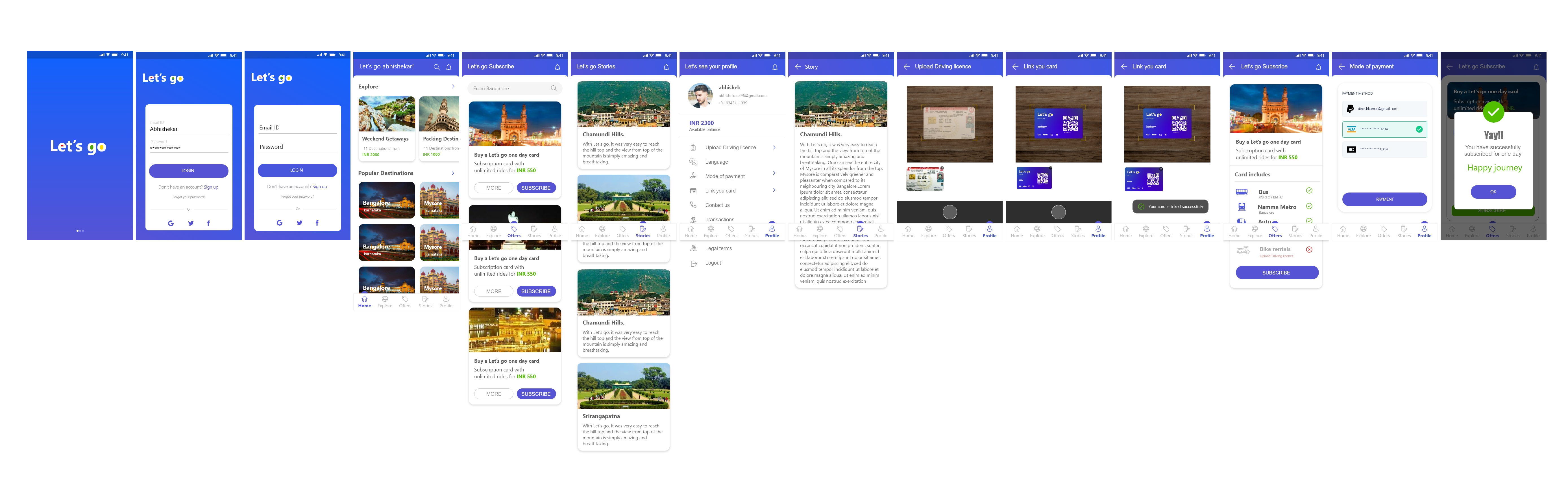 Let's Go app is a transportation app that aims to make daily travel easier for commuters in India. It allows users to book daily, weekly, and monthly passes for BMTC buses online, as well as tickets for DTC buses online. It also provides live tracking of DTC buses and other transportation options such as cabs, ola, and more. The app is designed to be a one-stop solution to all the hassles of regular transportation options and the struggle to find reasonably priced short distance rides. The app also supports the environmental and social sustainability of the cities and the communities. The app's design followed a user-centered design process, and resulted in a user-friendly, intuitive, and attractive interface, that provided users with a seamless and satisfying travel experience. The app's design also followed the principles of simplicity, clarity, and accessibility, to ensure the app's usability and appeal. The app's design was validated and refined through user testing and feedback, and was ready to be launched in the market.